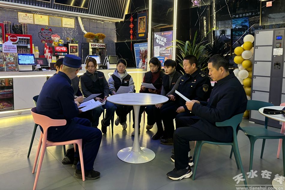 文化法律队工做人员细致查抄放映厅设备运转、影片放映天分及版权环境;确保群众渡过一个平安的新春佳节。