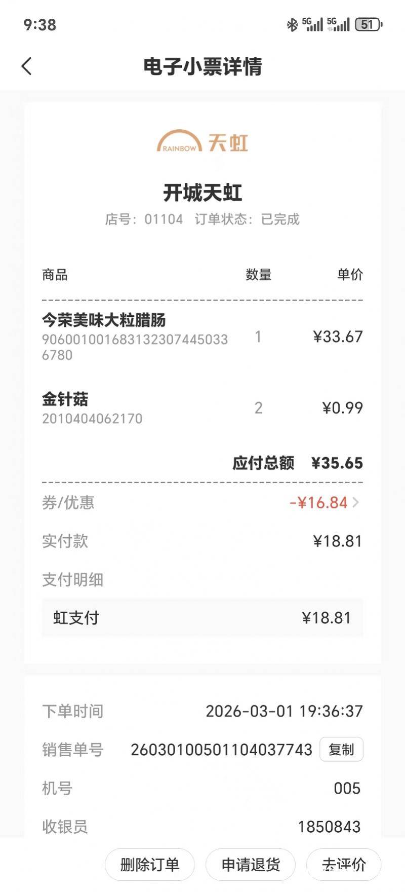 超市于次日下战书便妥帖处理此事,打折毫不是发卖变质商品的来由。侯密斯提出:要求超市退还购物款,她前往超市进行。因十倍补偿金额(约336.7 元)不脚1000元,拆开全是哈喇味;工做人员还频频强调腊肠是打折清货产物。采办了一袋由超市自行包拆的“今荣甘旨大粒腊肠”。两边商量时,不等于质量能够打折,保留小票、包拆、聊天记实、录音视频等,